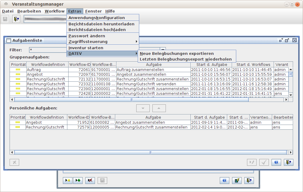 Entwicklung eines Warenwirtschaftssystems für die Verwaltung und Abrechnung von Veranstaltungen. Diese Java™-Anwendung eignet sich auch zur Organisation großer Veranstaltungen mit vielen Teilnehmern und ist mandantenfähig. Sie beinhaltet ein CRM, in dem alle Informationen zu den Kunden, z.B. Branchen, Rabatte, Ansprechpartner, Veranstaltungsteilnahmen und die gesamte Korrespondenz zusammengefasst sind. Weitere Funktionen sind unter anderem: Phonetische Suche, Angabe von Kommunikationsmedien wie Instant Messaging, Versand personalisierter E-Mails aus der Anwendung, Gesprächsnotizen mit Wiedervorlage-Funktion, Artikel- und Auftragsverwaltung für Verkauf und Vermietung, Teilnehmer- und Besucher-Listen, mehrsprachige Textbausteine, konfigurierbare Workflows für Angebot-, Auftrags- und Rechnungserstellung sowie für Wareneinkauf, anpassbares Berichtswesen, DATEV-Export, Inventur.